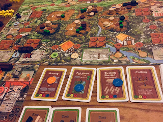 When winter came we were all able to eat and keep warm. Nobody did much logging though - we didn't have any sleds. All of us completed two tasks each, and I thought Chris might have nabbed a win when thanks to his planned work he milled up no less than six tree trunks on the final round and sold the lot. But his tasks were less valuable than mine, monetarily speaking, and Adam had only completed one- wait a minute! There's Adam, completing his second task on the last turn of the game. Adam!!!